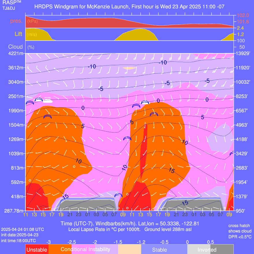 This site can get a strong inflow flowing in from the Whistler Valley. It is localized over the town of Pemberton. It may not be possible to detect this wind on launch or while flying. Look for the big white windsock on “the Dome” out front of the lower launch. If it is outstretched from a South (wind from the left looking from launch) avoid launching into it. If you are already in the air returning to land, call for radio confirmation of wind conditions in the LZ. If the “Express” has arrived, it’s not a big deal just fly NW down Pemberton Meadows, or SE and land in one of the big fields towards Lillooet Lake.